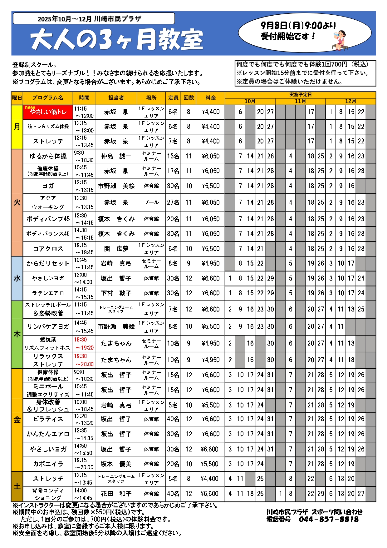 開催日・料金・講師については「大人の3カ月教室」チラシをご覧ください。