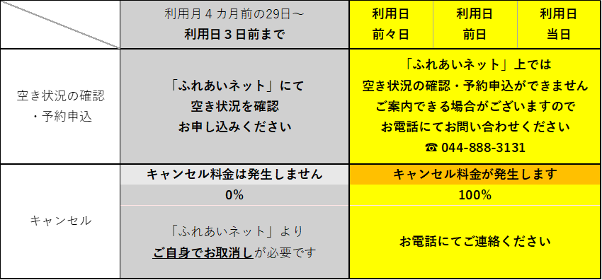 ※ご利用希望日3日前までは、「ふれあいネット」上にて空き状況の確認・予約申込をお願いいたします。